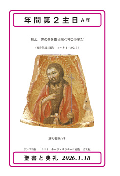 「見よ、世の罪を取り除く神の小羊だ」(福音朗読主題句 ヨハネ1・29より)洗礼者ヨハネ テンペラ画 シエナ キージ・サラチーニ宮殿 15世紀 きょうの福音朗読箇所は、ヨハネ福音書1章29-34節。その前の19節から28節では洗礼者ヨハネの登場が語られており、それに対してファリサイ派に属する祭司やレビ人たちが、彼に「メシアなのか」「エリヤなのか」「預言者なのか」と尋ねると、洗礼者ヨハネはそれを否定する。そして「わたしの後から来られる方」のことを告げるのである。続いて、きょうの朗読箇所では、イエスが自分の方へ来るのを見て、「見よ、世の罪を取り除く神の小羊だ」(1・29)と宣言する。自分の後に来られる方に対して、「その履物のひもを解く資格もない」(1・27)とへりくだる姿勢を示した洗礼者ヨハネが、今や、実際にイエスの登場を告げる場面である。その中でまた、間接的に、彼がイエスに洗礼を授けたときの聖霊の降下の出来事も想起されている。このような文脈において、イエスの登場がまさしく聖霊に満ちあふれた救い主(メシア)の顕現であることが示されている。 表紙絵は、そのような救い主の到来についての決定的なあかしをした洗礼者ヨハネの半身像を描いている。彼を描くキリスト教美術は実に多彩である。その中でも、荒れ野に現れ、殉教を遂げるに至る彼の生き方の鮮烈さが表現されている。きょうの表紙絵の洗礼者ヨハネは、ある意味で、穏やかと力強さを合わせて示しているようである。漂う静謐(せいひつ)さも印象的である。内衣は「らくだの毛衣」(マルコ1・6; マタイ3・4)の雰囲気があるが、赤い外衣は、すでに聖人の輝きへの賛美があふれている。頭を囲む光輪とともに、キリストに結ばれた聖人として、すなわち洗礼者聖ヨハネとして、尊敬を込めて描かれている。 ただし、この洗礼者ヨハネの像は、彼自身を描くことだけで完結していない。彼の上半身の姿勢とその眼差しは、自身の右手(画面の向かって左)のほうに向かっている。それに対して、右手の指は、反対側のほうを少し上向きに指している。このような姿勢やしぐさについて、やはり、右手の指はイエスを指していると考えられる。そして、半身全体と眼差しは、人々のほうに向かっている。きょうの福音と合わせるなら、イエスを救い主として、つまり「世の罪を取り除く神の小羊」として、人々に示している洗礼者ヨハネの姿と考えるのが自然だろう。洗礼者ヨハネを描く絵ではあっても、根底において目に見えないかたちで描かれている主人公はイエス・キリスト自身にほかならない。 さて、きょうは年間第2主日。この日は、典礼暦年の中での位置づけとして独特な意味合いをもっている。第2主日はどの年もヨハネ福音書が読まれるという特徴がある。A年=1章29-34節 (神の小羊イエスに対する洗礼者ヨハネのあかし)、B年=1章35-42節 (最初の弟子の召命)、C年=2章1-11節(カナの婚礼)である。これについては、『朗読聖書の緒言』(カトリック中央協議会、105項)で「年間第2主日の福音は、伝統的なカナの婚宴の箇所と、同じヨハネ福音書の他の二つの箇所によって、公現の祭日に祝った主の顕現との関連が保たれている」と述べられている。そして、朗読配分全体を眺めると、「主の降誕」「主の公現」「主の洗礼」を貫く、救い主である神の御子の現れという降誕節全体の中心主題が、年間第2主日はしっかりと引き継ぎ、示しているのである。 そのことを示すのが、きょうの第一朗読箇所のイザヤ書49章3、5-6節である。主である神が神の民イスラエルに向かって告げる「あなたはわたしの僕(しもべ)、イスラエル、あなたによってわたしの輝きは現れる」(49・2)や「わたしはあなたを国々の光とし、わたしの救いは地の果てまで、もたらす者とする」(49・6)ということばが、まっすぐにイエス・キリストに関連づけられている。この第一朗読は、主の降誕・夜半の第一朗読箇所(イザヤ9・1-3、5-6)、および、主の降誕・日中の第一朗読箇所(イザヤ52・7-10)ともしっかりとつながり、両方のミサで「遠く地の果てまで、すべてのものが神の救いを見た」という同じ答唱句が歌われる答唱詩編(夜半=詩編96、日中=詩編98)ともぴたりと呼応する。こうして、降誕節と年間第2主日はしっかりとした結びつきを示しつつ、次週の年間第3主日から、各福音書朗読を通してイエスの宣教活動の展開が想起されていく。 ところで、あらためて考えたいのは、洗礼者ヨハネの「見よ、世の罪を取り除く神の小羊だ」(ヨハネ1・29)ということばである。「小羊」という語は、旧約における過越の犠牲の小羊(出エジプト12・1-28、一コリント5・7参照)や、自らをその小羊のように、多くの人の罪のあがないのいけにえとしてささげる主の僕(しもべ)の姿(イザヤ52・13~53・12)を踏まえるものであり、ヨハネの福音書や黙示録において、イエス・キリストの存在とその全生涯を象徴する語となっていく。 そして、この洗礼者ヨハネのあかしのことばが