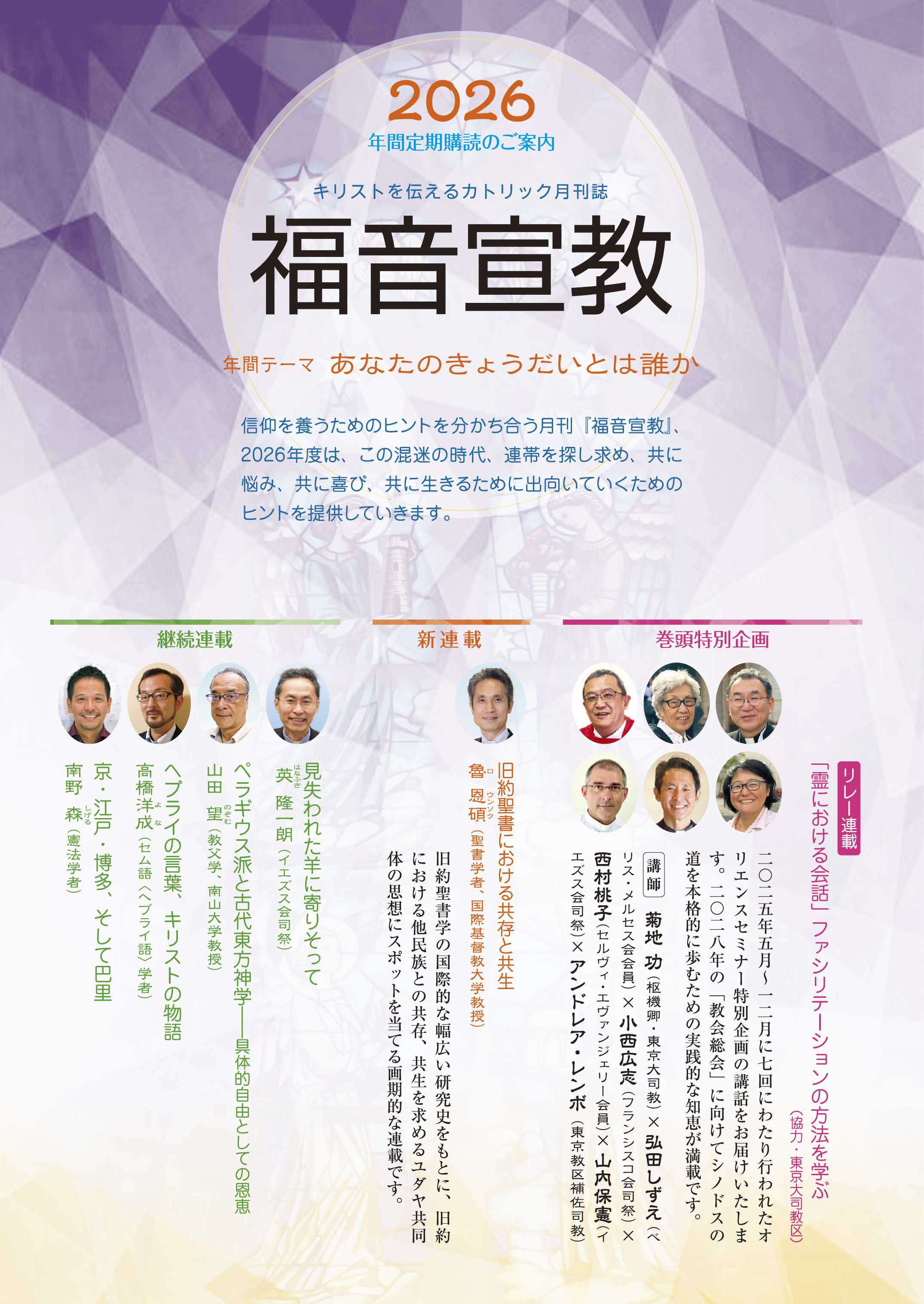 連続座談会 日本カトリック司教団『見よ、それはきわめてよかった――総合的な【インテグラル】エコロジーへの招き』を読む 2024年7月に発行されたこの文書の作成に関わった司教、司祭、信徒の皆様をお招きしての座談会です。その内容をご紹介し、語り合っていただきます。 |