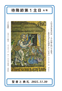 人の子が来るのは、ノアの時と同じである。……あなたがたも用意していなさい(マタイ23・37、44より)ノアの箱船 モザイク ヴェネツィア サン・マルコ大聖堂 13世紀 ヴェネツィアのサン・マルコ大聖堂の壁画モザイクには、創世記のアダムとエバの物語、ノアの洪水と箱船の物語が丹念に描かれている。そこにおける人間や動物の描き方は非常にダイナミックでかつ繊細でもある。 ノアの箱船に関するモザイクが表紙に掲げられているのは、きょうの福音朗読箇所であるマタイ24章37-44節にちなんでいる。典礼暦は、待降節第1主日から新しい年に入る。主日朗読はA年の朗読配分となり、きょうのマタイの箇所では、ノアの洪水の出来事が、「人の子は思いがけない時に来る」(マタイ24・44)ことに備えるよう呼びかけるイエスの教えの中で思い起こされているものである ノアの洪水のエピソード(創世記6~9章)では、ノアとさまざまな生き物たちが箱船によって生き延びることを約束されている一方、堕落し、不法に満ちていた他のすべての「肉なるもの」が滅ぶことになる。そのような命運の分岐に焦点が当てられている。それは福音朗読箇所の中で(マタイ24・40-41)、イエスが畑にいる二人の男の態度の対比をもって教えている内容ともつながる。この譬えと、ノアの洪水の想起を通して、キリストの再臨に備える目覚めが呼びかけられているのである。この呼びかけとともに待降節が始まり、このような終末における主の来臨に備える中で、第一の来臨(神の子の受肉、主の降誕)の想起に向かっていく。 ノアの物語を参照させることによって、ここでのイエスの「用意していなさい」というメッセージは、非常に大きな展望にあることが感じられてくる。個人的な生き方に対する諭しや戒めであるだけでなく、主の来臨に備えることは、命あるすべてのものの存亡にも関与することを思わせる。「神に従う無垢な人」(創世記6・9)であったノアは、洪水による滅びの中から、新しい未来を約束された人類の第二の出発を刻む者として祝福され、契約の恵みを受ける(創世記9章)。そのことを思うと、イエスの呼びかけには、主を待ち望み、迎え入れる人に約束される新しい命に対する使命への招きが含まれているように感じられる。 ちなみに、新約聖書の中で、ノアは、ここのマタイの箇所24・37-38(および並行箇所ルカ17・26-27)のほかにも、イエスの誕生を準備した人々の系図の一角として(ルカ3・36)、また信仰の模範として(ヘブライ11・7)思い起こされる。さらにノアの箱船に乗り込んだ8人が水を通って救われたことが洗礼の予型(前もって表すもの)として語られることも重要である(一ペトロ3・20;二ペトロ2・5参照)。 主キリストを迎え、主に従っていく生き方への招くという意味で、待降節第1 主日におけるノアへの言及は大変意味深い。待降節第1主日のミサへの呼び招きと、ミサからの派遣には、そのような広大な展望が含まれており、信者に対してだけでなく、万人へのメッセージにもなっている。 このモザイクが描く場面は、すべて肉なるものを雄雌二つずつ箱船に入れるように命じられ(創世記6・19-20節)たノアが、それに忠実に従って行動したこと(同7・14-15)を、特に種々の鳥を描きながら表現している。ノアの忠実を通してなされた被造物の再生と存続のための行動という意味で、これは、救われる者たちの象徴となっている。 このような全存在、全生命的な展望をしっかり持った上で、第一朗読箇所イザヤ2章1-5節も味わってみよう。そこには、地上の国々や民の間の争いやいさかいが顧みられており、その中で、「終わりの日」(2節)、主が「国々の争いを裁き、多くの民を戒められる」(4節)と告げられる。剣を鋤(すき)とし、槍を鎌とすることによって健全な農耕生活、平和の中での国々の建設と民の成長が待望される。非常に現実的なイメージである。それは、今、現代世界の中で主の来臨、主の平和の完成を待ち望む我々にとっても関与すべき地上の事柄への示唆を含んでいるのではないだろうか。 聖堂は伝統的に船に譬えられ、信者が集う主要な空間は英語でネイブ(nave 船)と呼ばれる。ミサが行われる聖堂は、人類存亡の中から神の招きを受けた信仰者と生き物たちが運ばれる、それはまさしく船なのであろう。現代世界を襲う洪水や天変地異の中で、神のことばに寄り頼んで生きていくべき神の民の態度が、きょうの聖書朗読を通して強調されている。旧約朗読末尾(イザヤ2・5)の神の民への呼びかけ「ヤコブの家よ、主の光の中を歩もう」がまさにそれである。 第二朗読箇所であるローマ書13章11-14節aの使徒パウロの呼びかけも、見事にこの「光」のイメージを汲んでいる。「夜は更け、日は近づいた。だから、闇の行いを脱ぎ捨てて光の武具を身に着けましょう」(12節)、と。そして「主イエス・キリストを身にまといなさい」(14節a)と告げる。キリスト者とはキリストにほかならない「光の武具」を身にまとう者である
